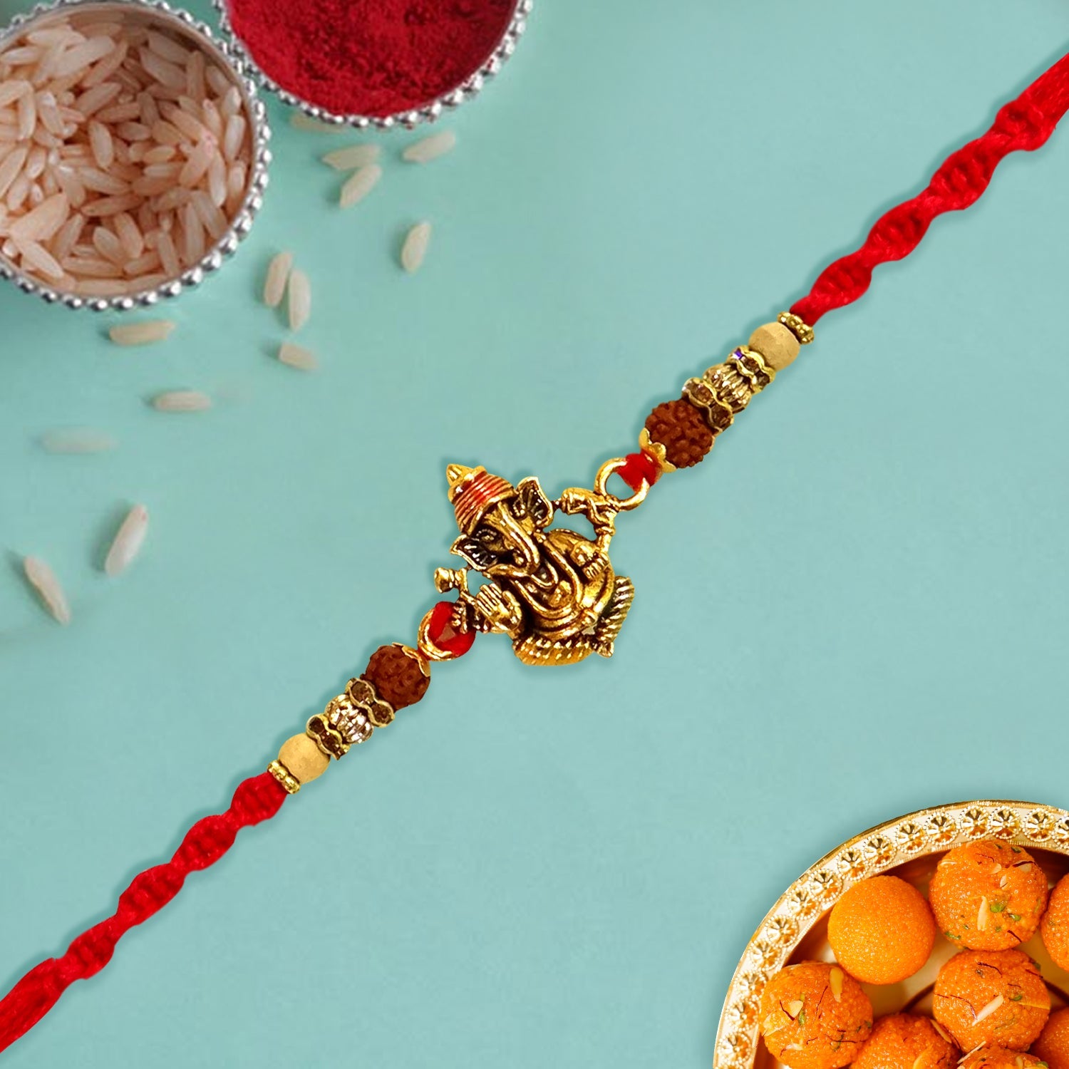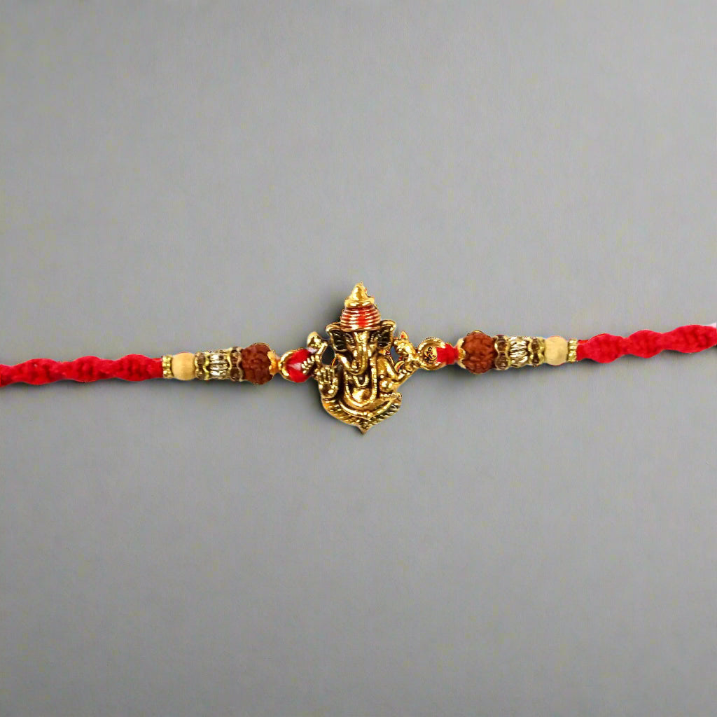 - Ganesh ji with Rudraksha Rakhi combines two powerful symbols in Hindu culture: Lord Ganesha and Rudraksha beads.